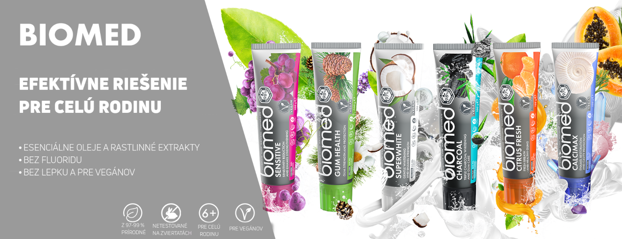 Zubné pasty pre celú rodinu, prírodné z viac ako 98%. Zubné pasty BIOMED sú určené pre rýchle a dokonalé odstránenie zubného povlaku, ochranu proti zubnému kazu, spevnenie zubnej skloviny, starostlivosť o ďasná a dlhotrvajúci svieži dych.